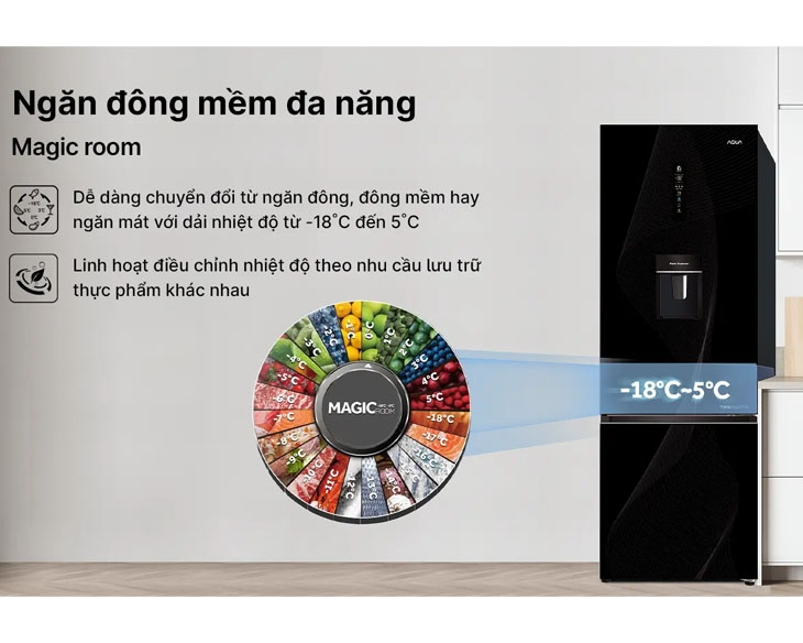 AQR-B380MA (WGP)U1 có ngăn tùy chỉnh nhiệt độ Magic Room cho phép tùy chỉnh nhiệt độ từ -18⁰C đến 5⁰C. Ngăn Magic Room sẽ đáp ứng tối ưu các nhu cầu sử dụng của gia đình bạn bằng cách chuyển đổi thành ngăn đông, ngăn lạnh hoặc ngăn đông mềm.
