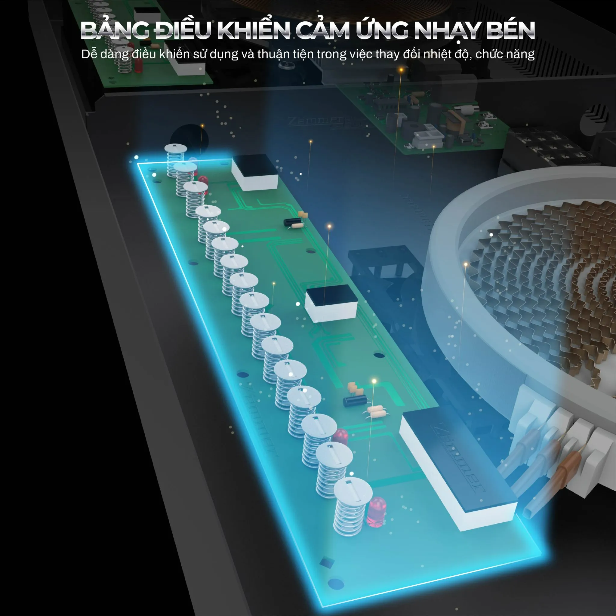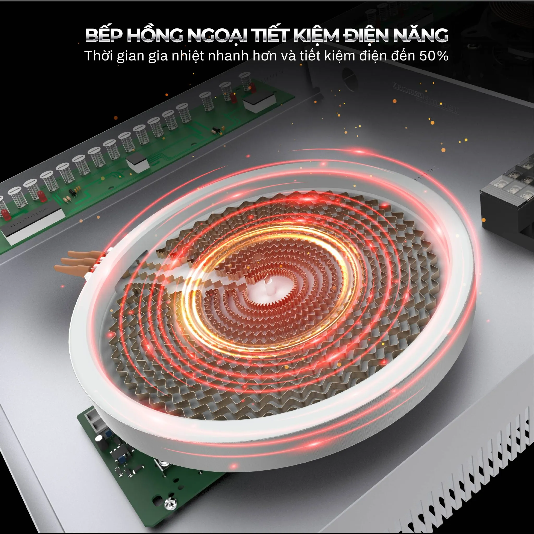 Bảng điều khiển slider tiện lợi, điều chỉnh mức công suất chính xác. Vùng nấu hồng ngoại phân bổ nhiệt lượng đều, liên tục giúp các món xào, rán được thơm ngon hơn.