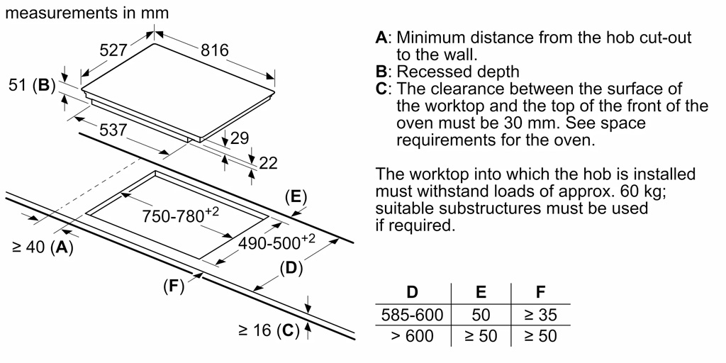 - Kích thước lắp đặt: 750-780R x 490-500S mm