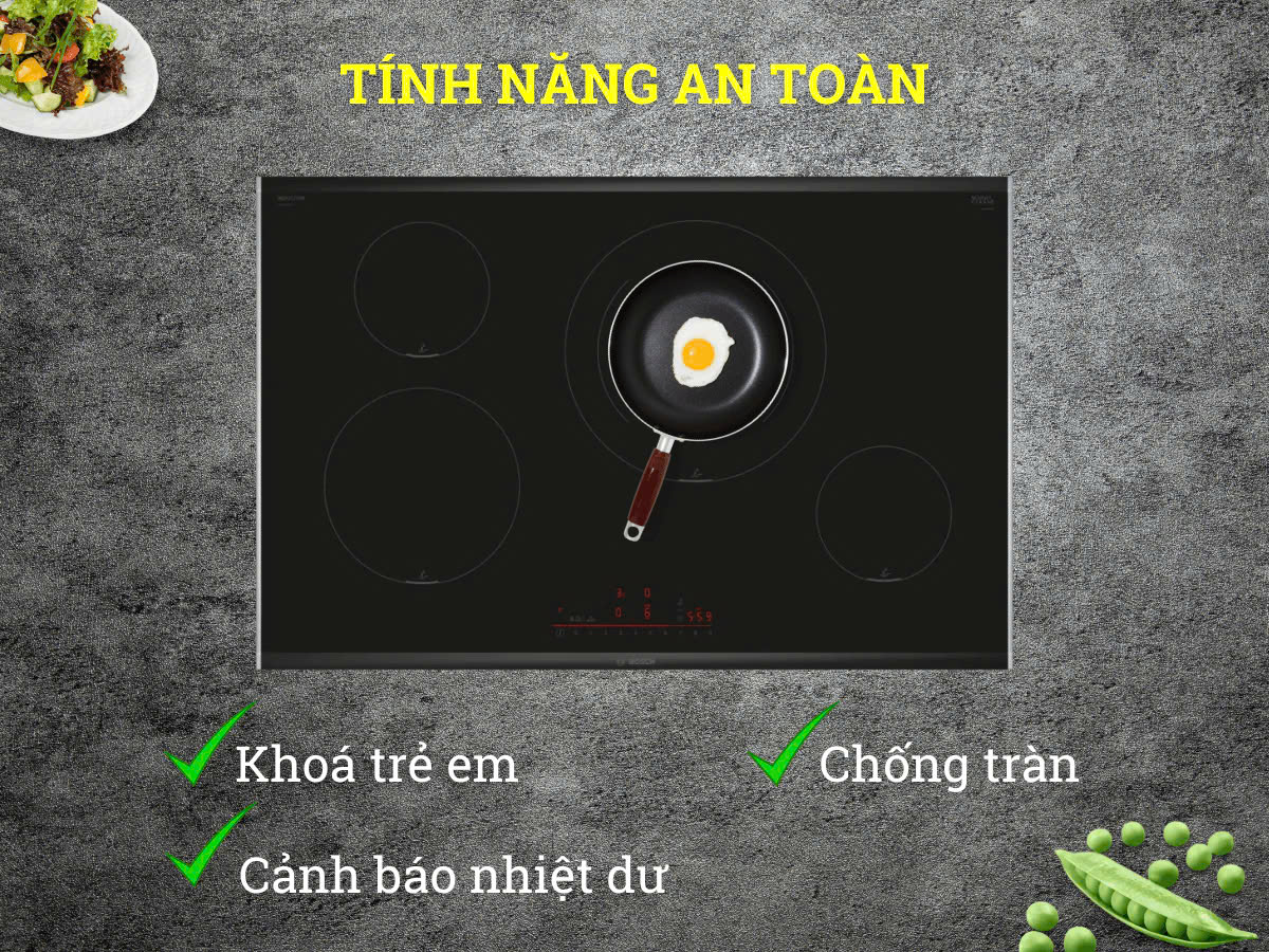 Bếp từ Bosch PIE875HC1E có chức năng an toàn khi tràn tăng thêm tiện ích cho người dùng. Khi phát hiện có sự cố nước tràn xuống bảng điều khiển, bếp sẽ tạm thời ngắt công suất và lưu lại các cài đặt nấu hiện tại. Bạn có thể lau chùi nhanh mặt bếp sau đó tiếp tục nấu mà không cần phải tắt bếp và cài đặt lại từ đầu.