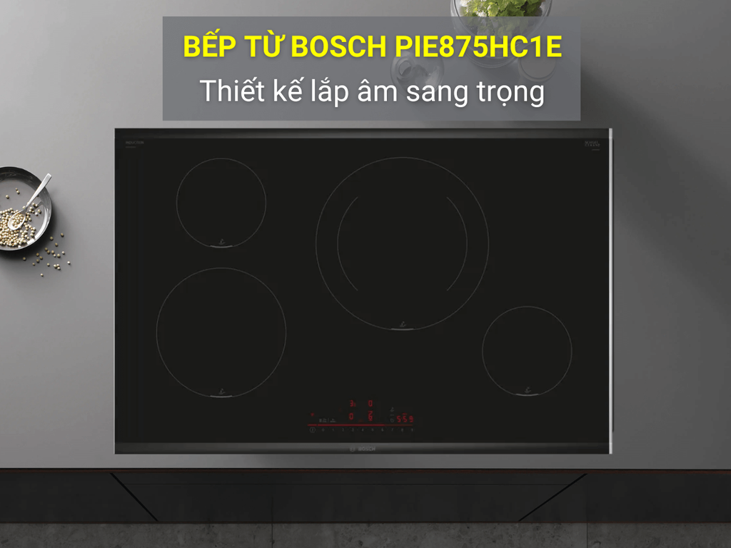 Bếp từ Bosch PIE875HC1E thiết kế 4 vùng nấu cho phép nấu nướng cùng lúc 4 món khác nhau tiện lợi và tiết kiệm thời gian, cùng công suất lớn và chức năng Booster giúp nấu nhanh hơn. Bếp cũng sở hữu thiết kế ấn tượng với mặt kính đen bóng nguyên khối, chịu nhiệt tốt và độ bền cao, được vát cạnh và viền kim loại tinh xảo, tăng thêm thẩm mỹ cho không gian nấu nướng.