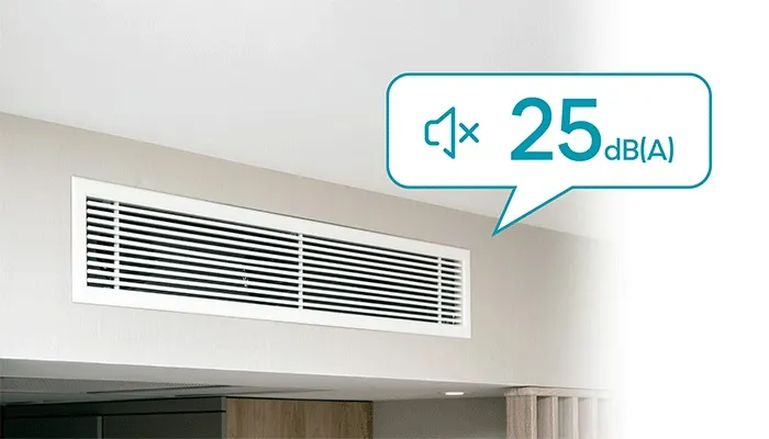 Độ ồn của dàn lạnh dấu trần nối ống gió ở chế độ hoạt động yên tĩnh chỉ từ 25 dB(A), phù hợp cho các khách sạn, biệt thự và căn hộ cao cấp.