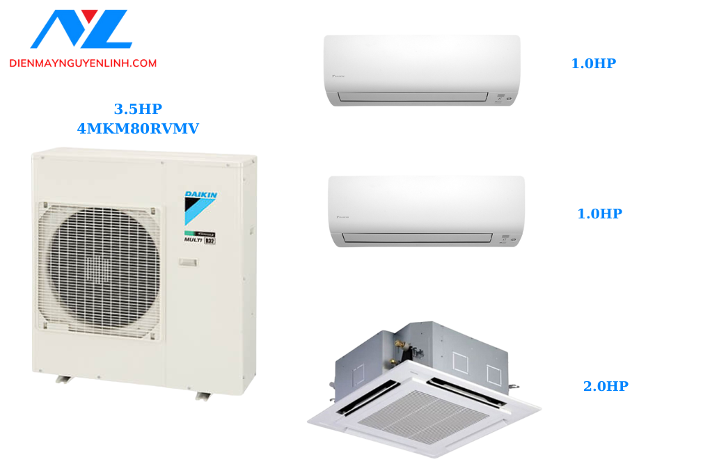 Công suất 3.5 HP (28.000 BTU): Kết nối tối đa bốn dàn lạnh, đáp ứng nhu cầu làm mát cho 3–4 phòng.