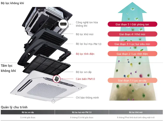Dàn lạnh cassette 4 hướng thổi Multi V 5 LG được trang bị hệ thống lọc không khí 5 cấp giúp loại bỏ các loại bụi bẩn đồng thời giản phóng ion đảm bảo sức khỏe cho người dùng. Cùng với đó, chức năng làm sạch không khí mang đến luồng không khí tươi mát, trong lành.