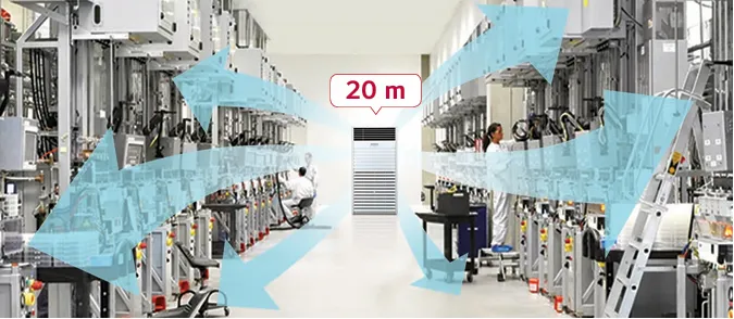 Điều hòa tủ đứng mới của LG hoạt động hiệu quả khi sử dụng ở những khu vực rộng lớn nhờ khả năng làm lạnh và sưởi ấm mạnh mẽ. Tốc độ và lưu lượng gió mạnh mẽ khiến luồng không khí có thể đạt cách điều hòa tới 20m.