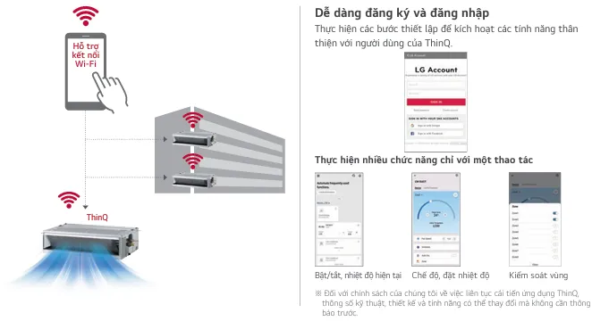 Người dùng có thể kết nối điện thoại thông minh với điều hòa trung tâm LG 2 chiều Multi V 5 này thông qua ứng dụng LG ThinQ để có thể điều khiển bật/tắt, thay đổi chế độ hay giám sát điện năng tiêu thụ một cách dễ dàng. Nếu có nhiều hơn một dàn lạnh trong một gia đình, có thể đặt nhiệt độ riêng cho từng dàn lạnh.