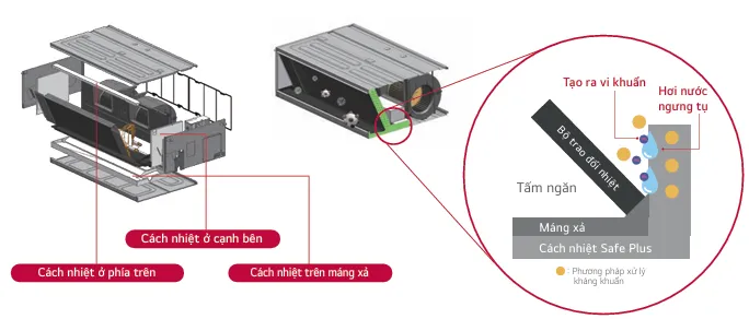 Dàn lạnh điều hòa trung tâm LG giá rẻ Multi V 5 được trang màng ngăn cách Safe Plus là phương pháp kháng khuẩn, chống lại sự phát triển của vi khuẩn và cung cấp luồng không khí sạch và trong lành hơn cho khách hàng.