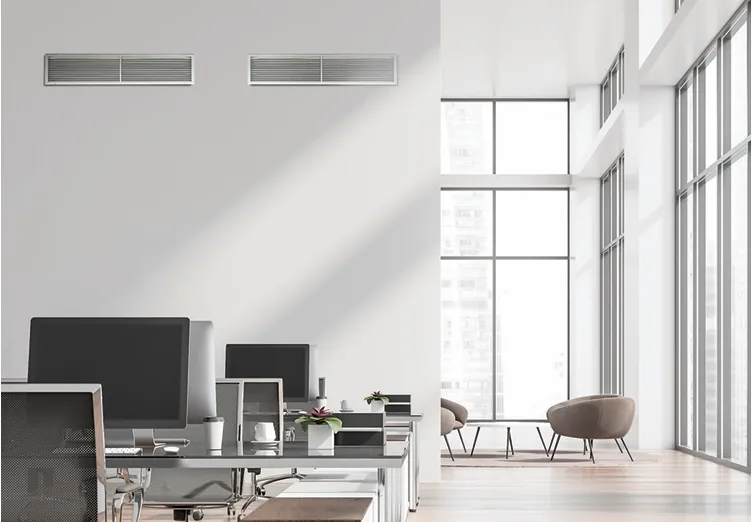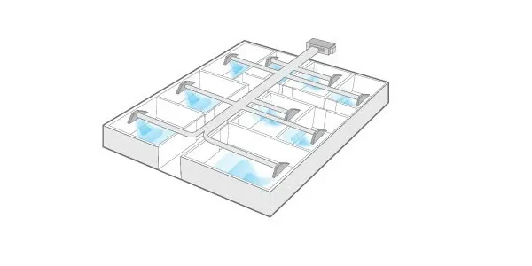 Dàn lạnh điều hòa trung tâm LG 2 chiều Multi V 5 có thể phục vụ nhu cầu làm lạnh/ sưởi ấm đồng thời cho nhiều không gian thông qua hệ thống phân phối gió như ống gió (ống gió cứng, ống gió mềm) và miệng gió (cấp/ hồi).