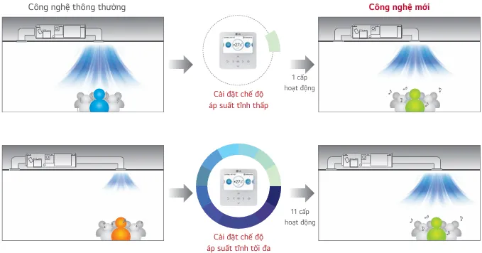 Tùy thuộc vào môi trường lắp đặt, dàn lạnh nối ống gió điều hòa trung tâm LG Multi V 5 điều khiển áp suất tĩnh với 11 cấp hoạt động nhằm