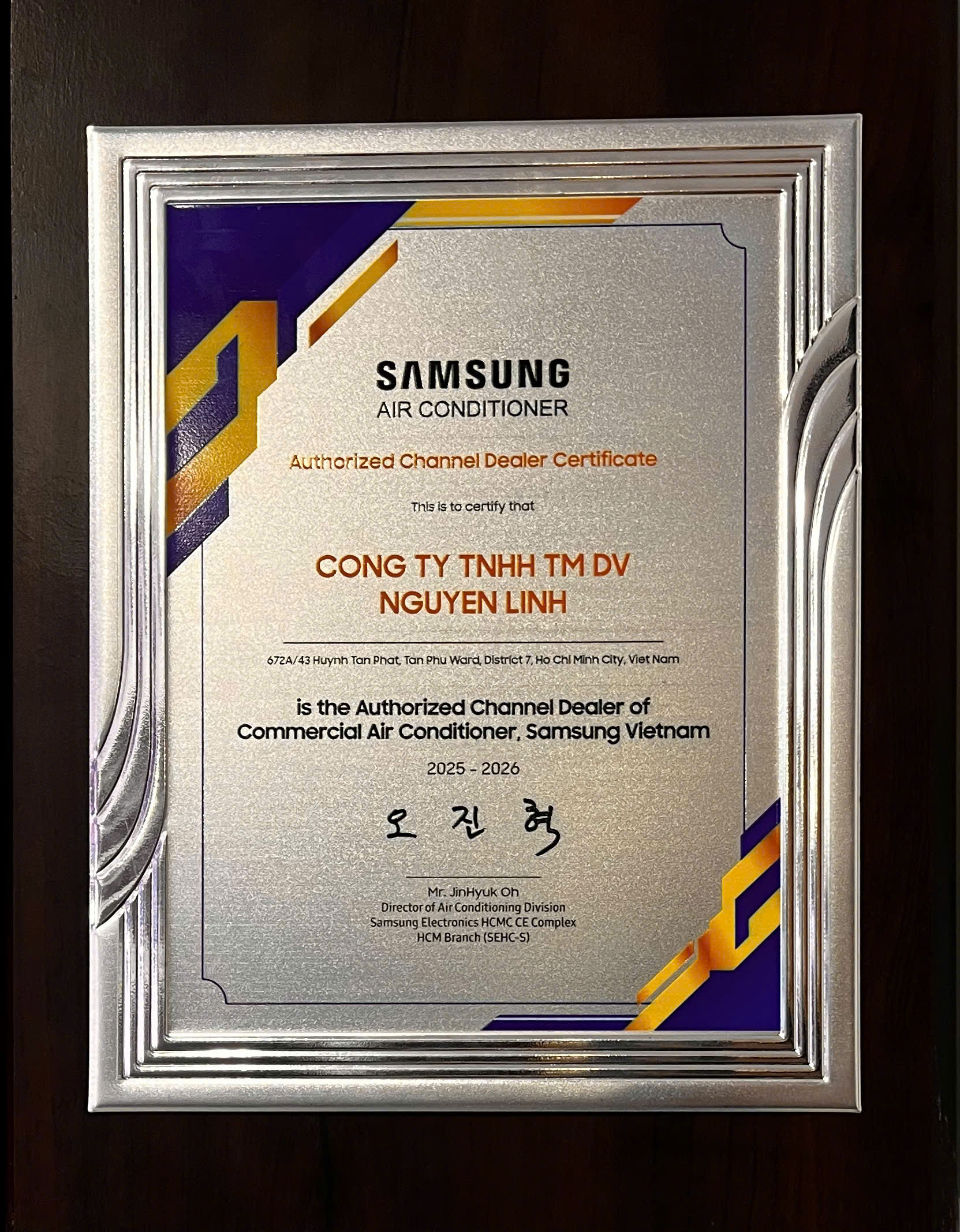 Trong suốt hành trình phát triển, Công ty TNHH TM DV Nguyễn Linh luôn đặt mục tiêu mang đến cho khách hàng những sản phẩm điện máy chất lượng, công nghệ tiên tiến cùng dịch vụ chuyên nghiệp. Nay, chúng tôi vô cùng tự hào khi chính thức trở thành Đại lý ủy quyền chính hãng của thương hiệu điều hòa không khí Samsung – tập đoàn công nghệ hàng đầu thế giới, khẳng định vị thế và uy tín trên thị trường điện lạnh Việt Nam.