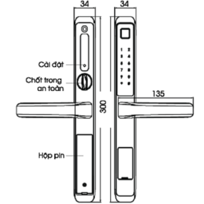 Tính năng | – Tay nắm có thể đổi chiều trái/phải – Chống nước tiêu chuẩn IP56 – Vô hiệu hóa thẻ bị mất – Nhắc nhở pin yếu – Chức năng riêng tư và thông phòng |