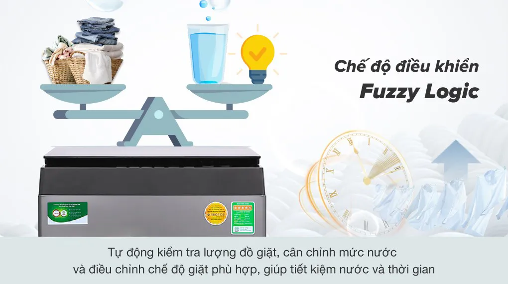 - Công nghệ suy luận ảo Fuzzy Logic: chế độ này có khả năng tự động kiểm tra lượng đồ giặt, từ đó tính toán và cân chỉnh mức nước cùng chế độ giặt phù hợp nhất, giúp tiết kiệm nước nhưng vẫn đảm bảo hiệu quả giặt sạch.