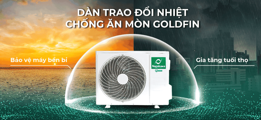 Dàn tản nhiệt của điều hòa Nagakawa được phủ lớp Golden Fin chống ăn mòn, giúp bảo vệ máy khỏi các tác nhân môi trường như hơi ẩm, nước mưa, muối biển,… nhờ đó, kéo dài tuổi thọ của sản phẩm.