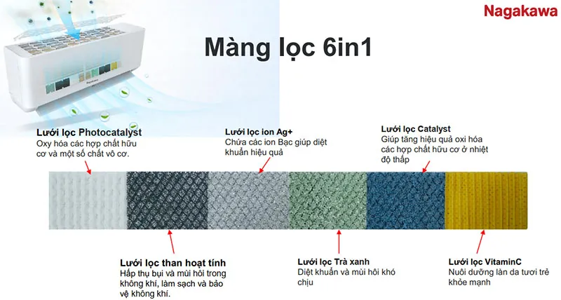 Nagakawa điều hòa được trang bị tấm lưới lọc lọc bụi, khử mùi hiệu quả, đem lại không gian thoáng mát, sạch sẽ dễ chịu cho người dùng.
