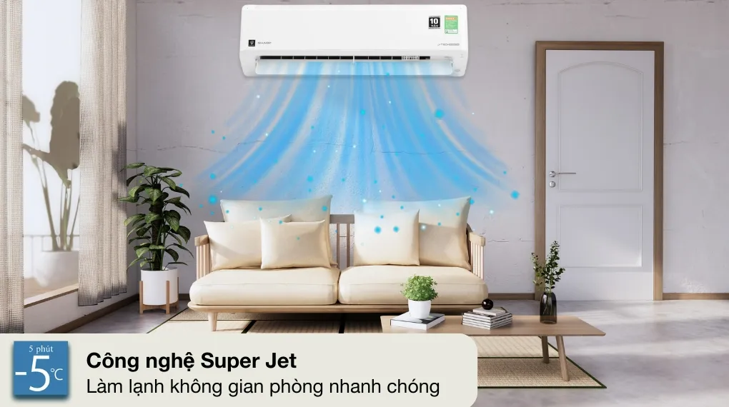 - Máy lạnh được trang bị công nghệ Super Jet - thổi luồng khí mát lan tỏa đều khắp không gian mang lại hơi lạnh tức thì, làm mát phòng một cách nhanh chóng và hiệu quả.