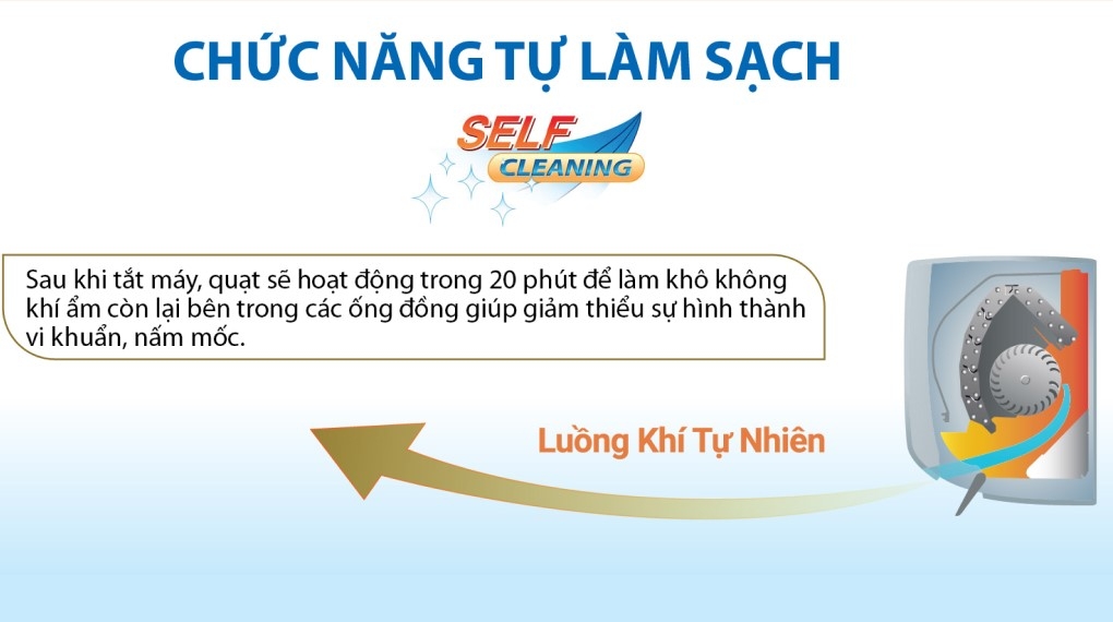 Khi kích hoạt tính năng Self Clean thì quạt của máy lạnh sẽ tiếp tục chạy thêm 20 phút sau lần bấm đầu tiên giúp loại bỏ độ ẩm và tác động tích cực đến lá nhôm dàn lạnh, ngăn chặn sự hình thành của nấm mốc và vi khuẩn.