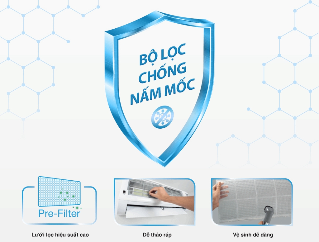 Máy lạnh Toshiba Inverter 1.5 HP RAS-H13C3KCVG-V tích hợp lưới lọc chống nấm mốc. Đây là lớp bảo vệ đầu tiên để lọc bụi bẩn và các chất gây kích ứng trong không khí, đảm bảo không gian sống của bạn luôn được duy trì trong tình trạng trong lành. Lưới lọc này cũng rất tiện dụng, cho phép bạn dễ dàng tháo ra để vệ sinh, giữ cho luồng khí luôn trong trạng thái sạch sẽ.