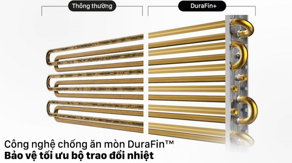 Dàn nóng được phủ lớp Durafin+ sẽ bảo vệ dàn nóng khỏi gỉ sét, duy trì hiệu quả vận hành tối ưu của dàn trao đổi nhiệt. Công nghệ Triple Protector Plus ngăn không cho máy nén và bộ điều khiển bị quá tải do tăng áp hoặc bị hư hỏng do dòng điện liên tục dao động, không ổn định. Lớp phủ cũng bảo vệ dàn nóng và lớp vỏ máy trong điều kiện thời tiết khắc nghiệt.
