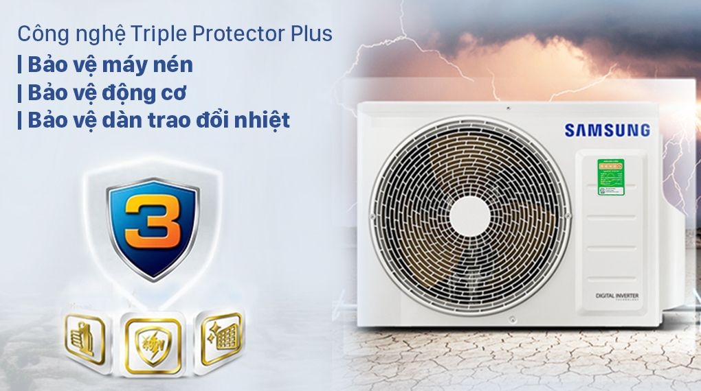 Sản phẩm được trang bị công nghệ Triple Protector Plus, giúp bảo vệ máy nén và bảng mạch trước các biến động điện áp, điều kiện môi trường khắc nghiệt và sự ăn mòn. Điều này giúp tăng tuổi thọ và độ bền của máy trong quá trình sử dụng lâu dài.