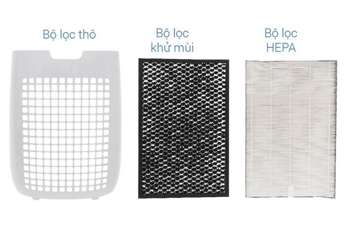 - Bộ lọc HEPA dày khoảng 4 cm có khả năng lọc bỏ được bụi bẩn, vi khuẩn, chất gây dị ứng, ngăn bụi PM0.3, PM2.5 (không thể giặt rửa).