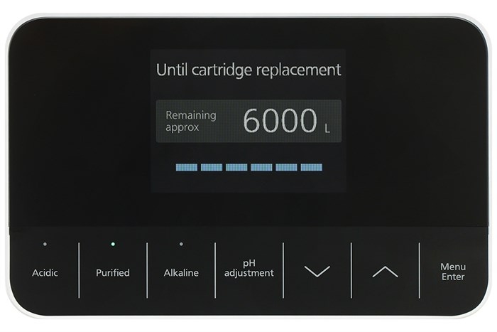 - Lượng nước đầu ra (dòng nước sinh ra): Nước kiềm: 1,5 L/phút [ở áp suất nước 100 kPa] (chế độ “Tiêu chuẩn”)Nước axit yếu: 1,3 L/phút [ở áp suất nước 100 kPa]