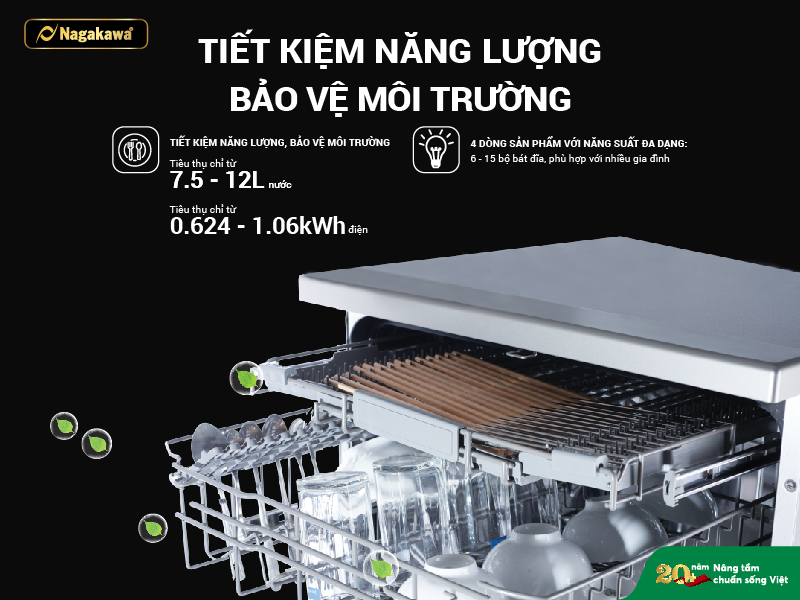 Máy rửa bát cao cấp Nagakawa NAG3601M15 có dung tích lớn và chứa tới 15 bộ bát đĩa linh hoạt chọn ngăn rửa riêng biệt theo tiêu chuẩn Châu Âu. Dung tích lớn nhưng chỉ tiêu hao trung bình chỉ 10 lít/ lần rửa, vô cùng tiết kiệm so với phương pháp rửa chén bằng tay truyền thống mà vẫn đảm bảo hiệu suất rửa cao, đánh bay những vết bẩn cứng đầu.