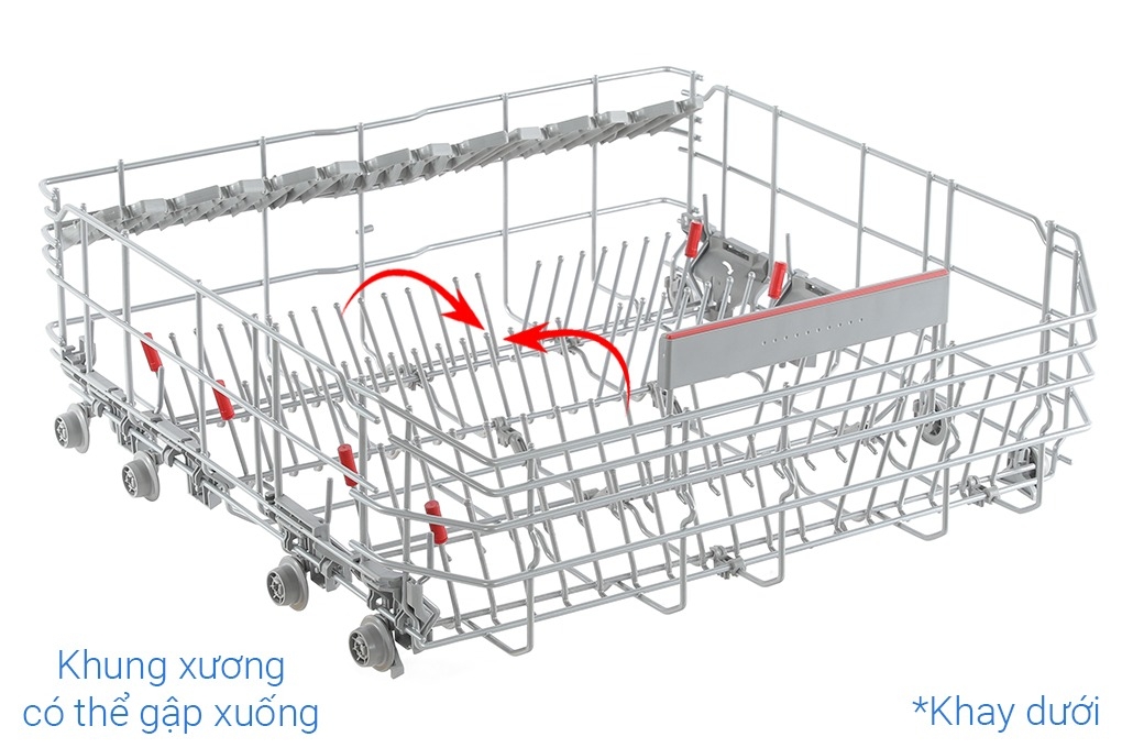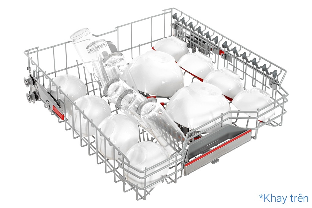 - Khay trên: Có thể trượt ra giúp bạn sắp xếp chén bát phù hợp với nhu cầu rửa.