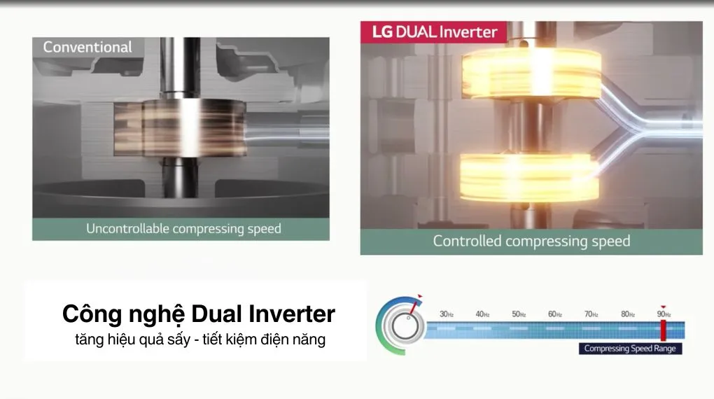 - Dual Inverter là công nghệ được LG mang vào máy sấy bơm nhiệt LG 10.5 kg DVHP50W. Công nghệ Dual Inverter hoạt động mang đến hiệu quả vận hành êm ái, đẩy nhanh tiến độ sấy khô quần áo mà vẫn tiết kiệm điện năng đáng kể.