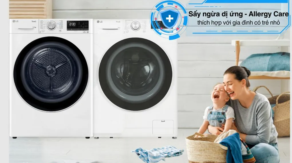 - Allergy Care - sấy ngừa dị ứng đến từ thương hiệu LG thích hợp với những gia đình có trẻ nhỏ thường xuyên giặt sấy quần áo trẻ, gấu bông, chăn nệm,... vì làn da của trẻ vốn mong manh và nhạy cảm hơn người lớn.