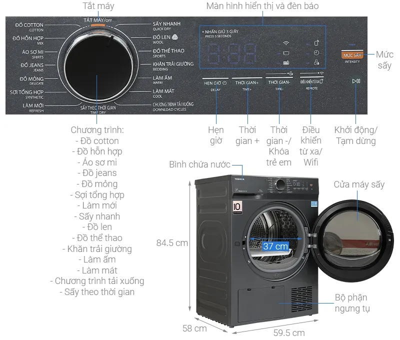 - Sấy khô hiệu quả, tiết kiệm năng lượng và giữ quần áo bền đẹp nhờ công nghệ Heat Pump.