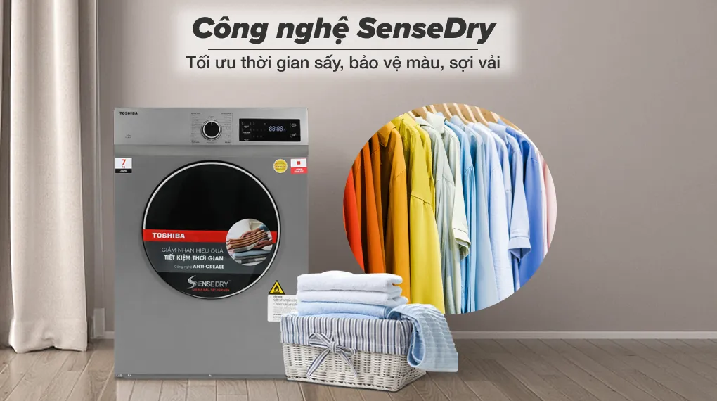 - Công nghệ SenseDry với cảm biến nhiệt độ giúp tối ưu thời gian sấy, đảm bảo đồ sấy không bị sấy khô quá mức, bảo vệ màu, sợi vải, tiết kiệm điện.