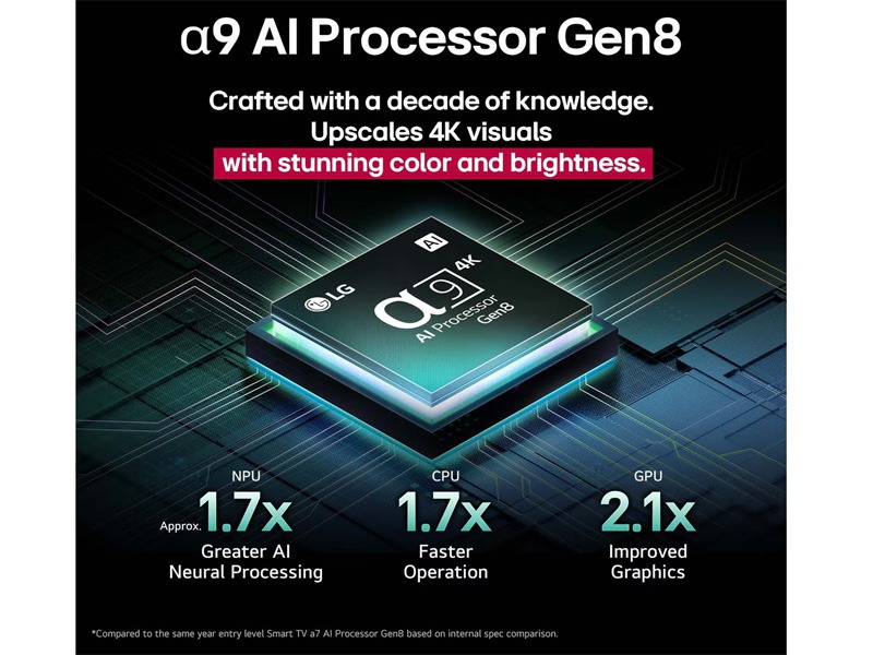 Bộ xử lý AI α9 Gen8 nâng cấp chất lượng hình ảnh với AI Picture Pro và AI Super Upscaling, tối ưu hóa độ sáng, độ tương phản và chi tiết hình ảnh, kể cả với nội dung không phải 4K. Tính năng HDR Dynamic Tone Mapping Pro phân tích từng khung hình để điều chỉnh độ sáng và màu sắc, mang lại hình ảnh sống động và chân thực.