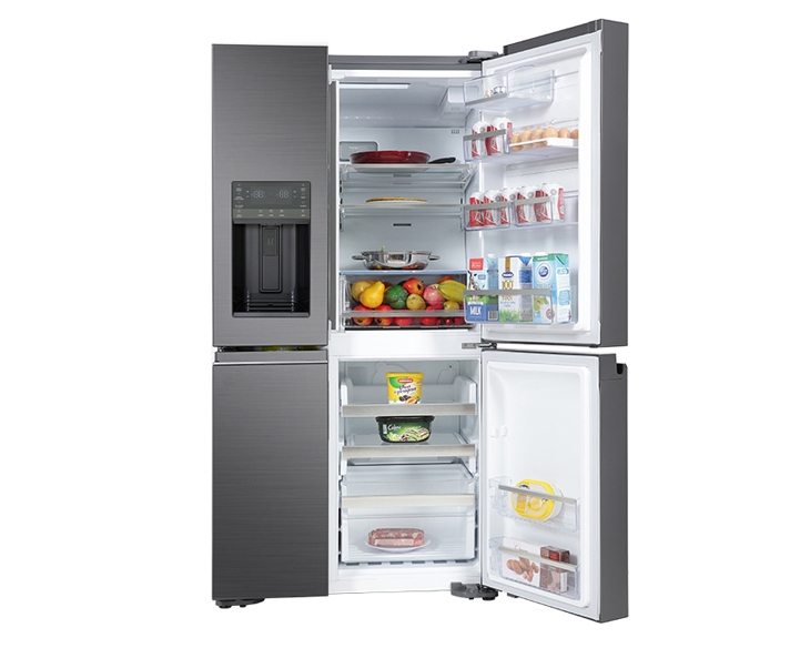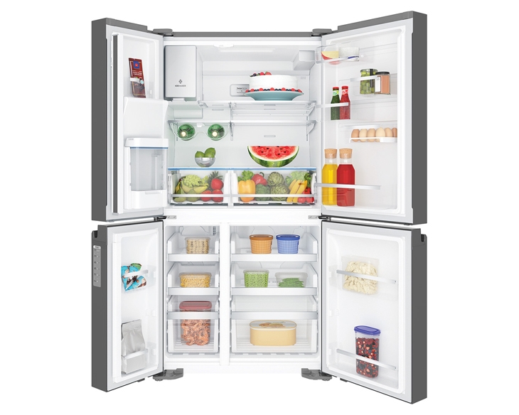 Đặc biệt, thiết kế 4 cửa mở còn mang đến nhiều lợi ích cho người dùng như: dễ lấy thực phẩm từng ngăn, hạn chế lẫn mùi chéo giữa các thực phẩm và tăng khả năng tiết kiệm điện vì bạn chỉ cần mở đúng phần cửa nơi chứa thực phẩm ( khoảng ¼ của tủ) thay vì mở cả nửa cửa tủ (khoảng ½ của tủ) như dòng tủ lạnh side by side.
