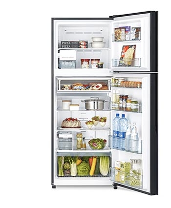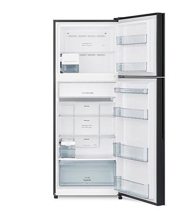 Hitachi Inverter 390 lít RFVY510PGV0 GMG là tủ lạnh ngăn đá trên với cửa tủ mặt kính nền đen sáng bóng, sang đẹp, dễ lau chùi, giữ cho tủ luôn đẹp như mới.