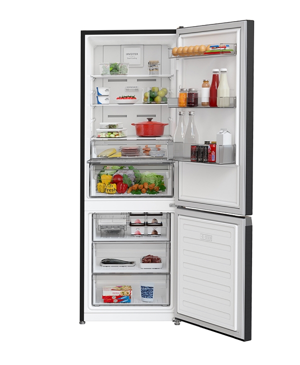 - Ngăn lạnh dung tích 266 lít: có các ngăn cửa có thể lưu trữ nhiều loại chai lọ đa dạng kích cỡ như bình nước, hộp sữa/nước, các lọ gia vị,… Ngăn rau củ tiện dụng và bảo quản tốt với công nghệ Max Fresh