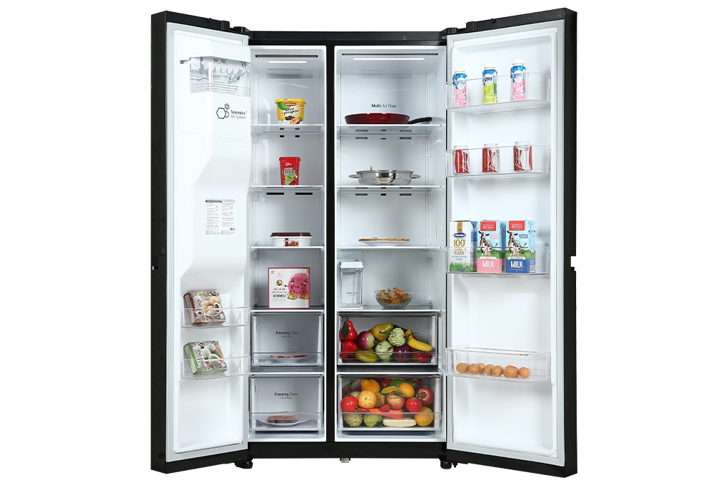 - Đây là mẫu tủ lạnh Side by side với chất liệu cửa tủ là thép không gỉ màu đen nhám sang trọng, hiện đại. Phần tay cầm được thiết kế âm tủ tạo vẻ ngoài tinh tế, tối giản.