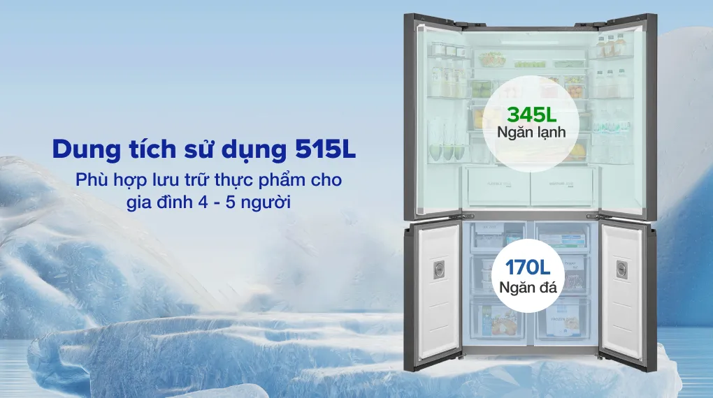 - Dung tích tổng 515 lít thích hợp với gia đình từ 4 - 5 thành viên có thể thoải mái lưu trữ thực phẩm.