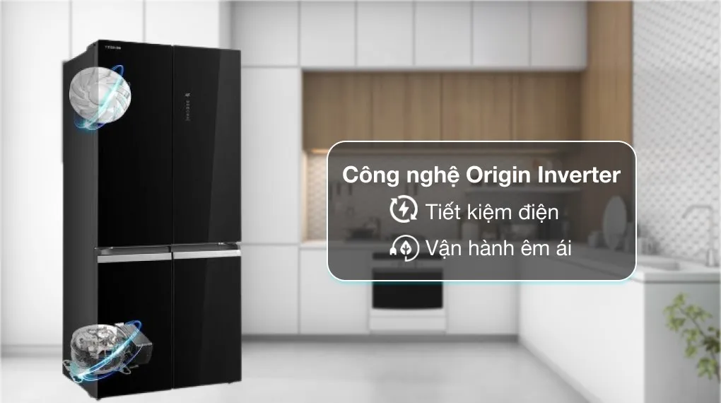 - Công nghệ Origin Inverter giúp tủ lạnh vận hành êm ái, tiết kiệm tối đa điện năng nhờ kết hợp máy nén và quạt Inverter.