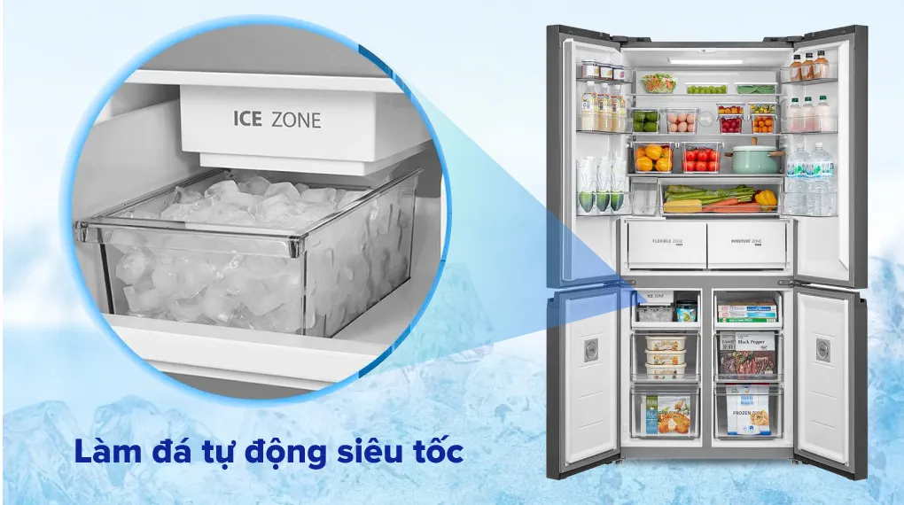 - Hệ thống làm đá tự động, nhanh chóng với công suất 158 viên đá/ngày.