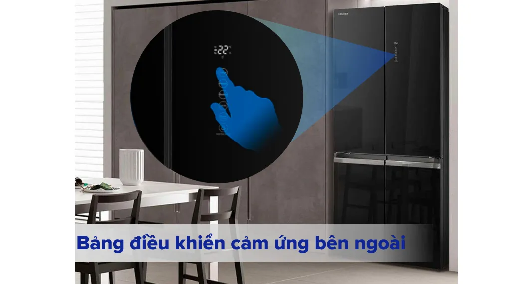 - Bảng điều khiển cảm ứng bên ngoài tủ lạnh Toshiba giúp điều khiển nhiệt độ các ngăn theo nhu cầu tiện lợi, tránh thất thoát hơi lạnh, tiết kiệm điện năng.