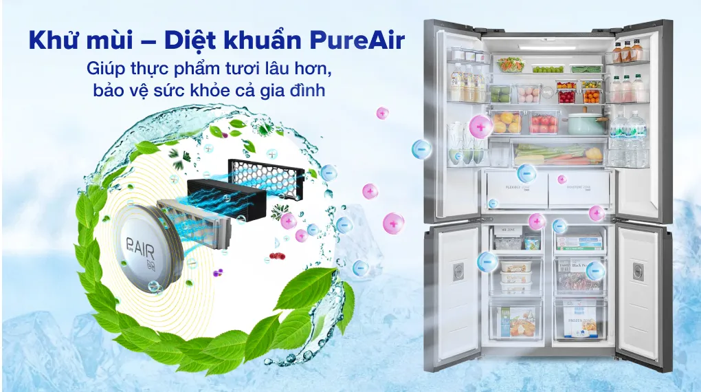 - PureAir tạo các plasma ion giúp kháng khuẩn đến 99.99%, khử sạch mùi hôi khó chịu bên trong tủ lạnh.