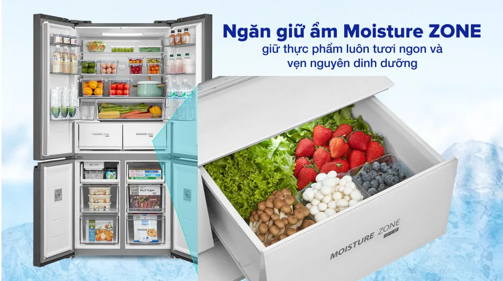 - Ngăn giữ ẩm The Moisture Zone với tấm chắn đặc biệt giúp duy trì độ ẩm ở mức 86%, giữ thực phẩm luôn tươi ngon và vẹn nguyên dinh dưỡng.