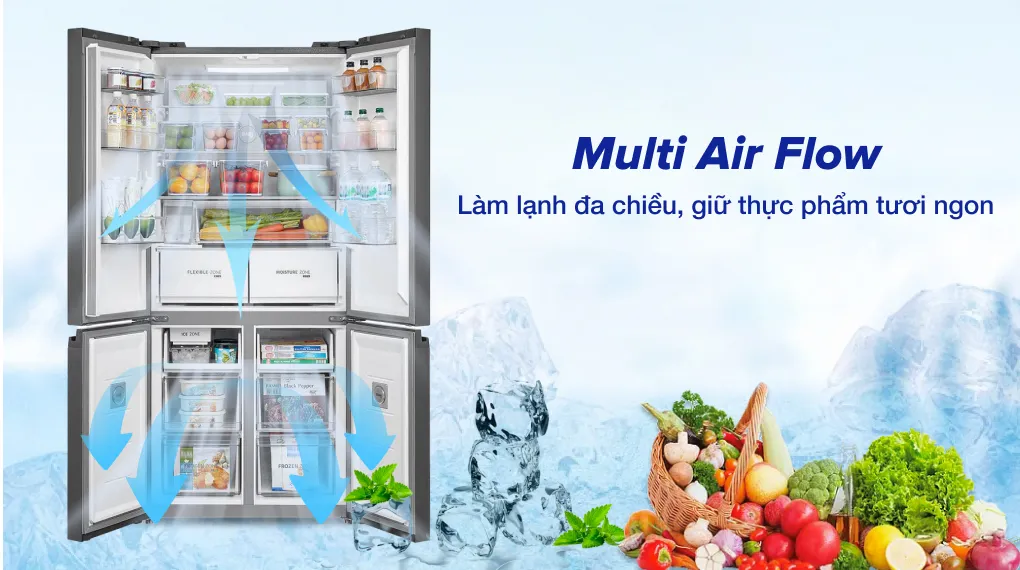 - Tủ lạnh Toshiba được trang bị công nghệ lạnh đa chiều Multi Air Flow giúp hơi lạnh lan tỏa nhanh chóng, đồng đều đến mọi ngóc ngách, giữ thực phẩm luôn tươi ngon, vẹn nguyên dinh dưỡng.