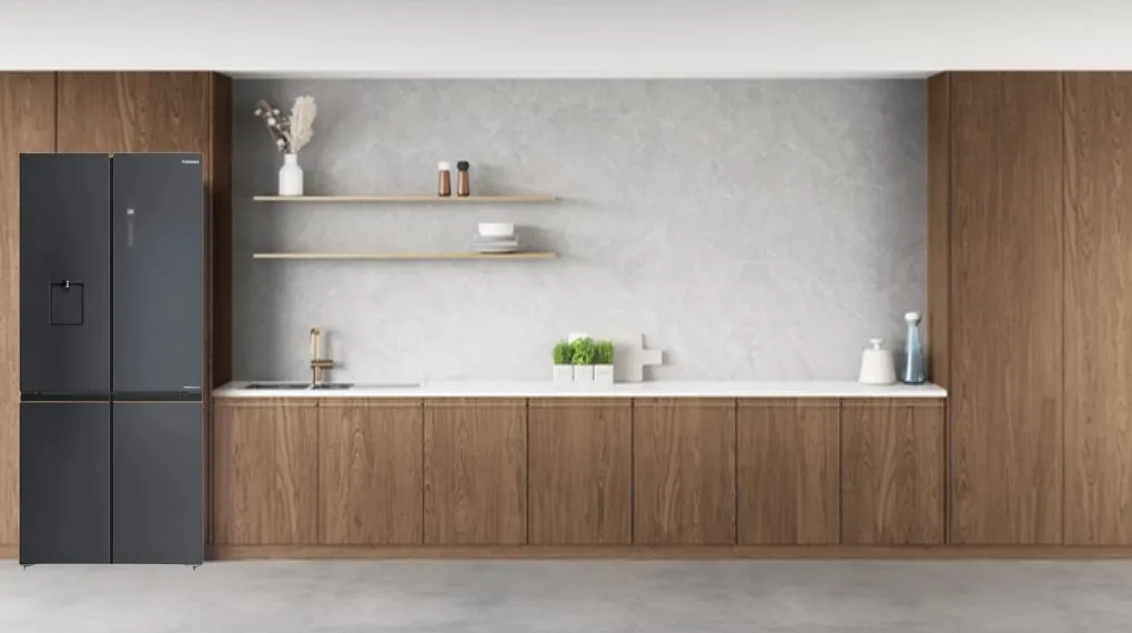 - Tủ lạnh Toshiba Multi Door 4 cánh hiện đại, phủ lớp thép xám Morandi thời thượng, chống trầy xước và hạn chế dấu vân tay hiệu quả.