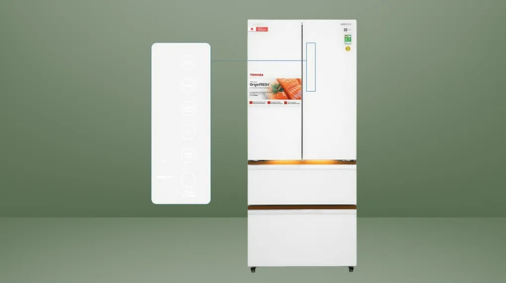 - Bảng điều khiển của tủ lạnh được thiết kế dạng cảm ứng đặt bên ngoài cửa tạo cảm giác liền mạch, người dùng tùy chỉnh các chức năng tiện lợi mà không cần mở cửa tủ nhiều lần, hạn chế việc thất thoát hơi lạnh ra bên ngoài tủ giúp tiết kiệm điện năng.