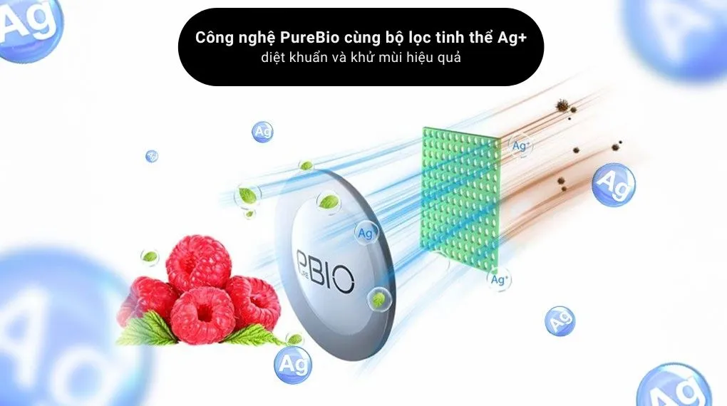 - Công nghệ PureBio có bộ lọc tinh thể Ag+ cho khả năng diệt khuẩn và khử mùi hiệu quả, góp phần bảo vệ sức khỏe cho bạn và gia đình. Điều này giúp tạo không khí trong lành, sạch khuẩn bên trong tủ, đảm bảo thực phẩm được tươi ngon và chất lượng trong suốt thời gian bảo quản.