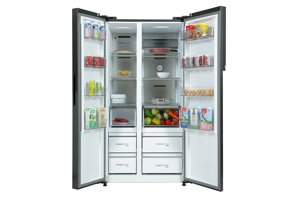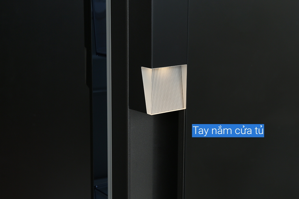 - Thiết kế kiểu Side by side với chất liệu cửa tủ là kính nên mang đến sự tinh tế và hiện đại cho không gian. Phần tay cầm có thiết kế âm ẩn nên nhìn chiếc tủ giống như một khối liền mạch mang đến sự gọn gàng.