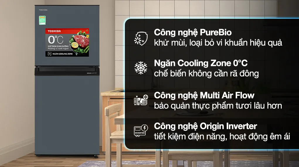 Công nghệ Origin Inverter: Sử dụng máy nén và quạt Inverter có khả năng duy trì nhiệt độ làm lạnh ổn định bên trong mà vẫn đảm bảo tủ lạnh tiêu thụ điện năng thấp nhất. Đồng thời còn làm giảm thiểu tiếng ồn phát ra trong suốt quá trình tủ lạnh Toshiba Inverter này hoạt động.