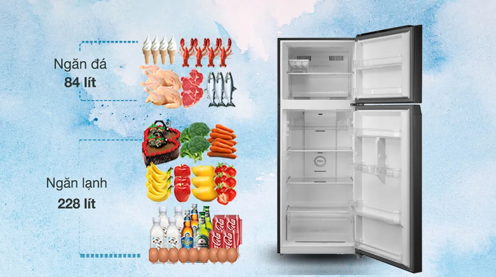 - Sản phẩm có dung tích sử dụng 312 lít, đáp ứng nhu cầu bảo quản thực phẩm tối ưu cho các hộ gia đình từ 3 - 4 người.