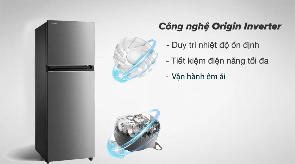 Công nghệ Origin Inverter: Kết hợp quạt và máy nén để duy trì nhiệt độ bên trong tủ lạnh Toshiba luôn ổn định, đồng thời còn giúp cho tủ lạnh vận hành êm ái và tiết kiệm điện năng.